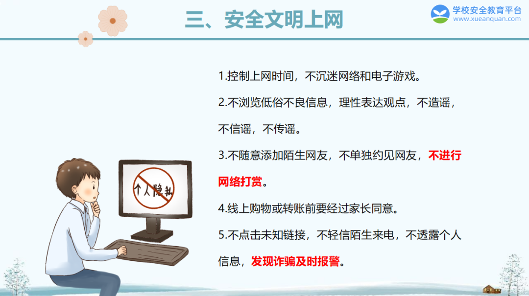 3. 不沉迷网络游戏、直播,抵制不良信息,警惕“隔空猥亵”;