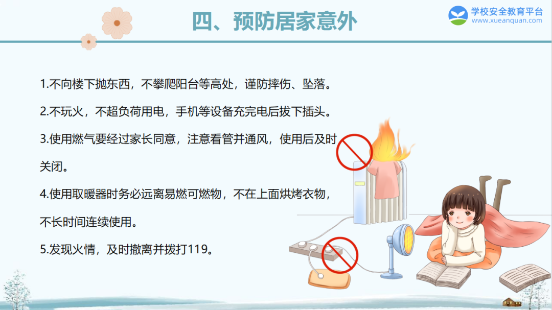 4. 选购正规电取暖设备,严格按说明书使用,远离易燃物;