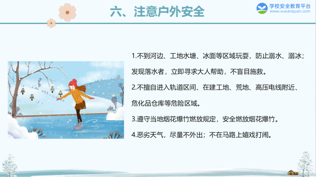 4. 不在非正规冰场和野外冰面玩耍,远离野外危险水域;发现他人溺冰、溺水,立即呼救或拨打110、120电话求助,不盲目下水施救;
