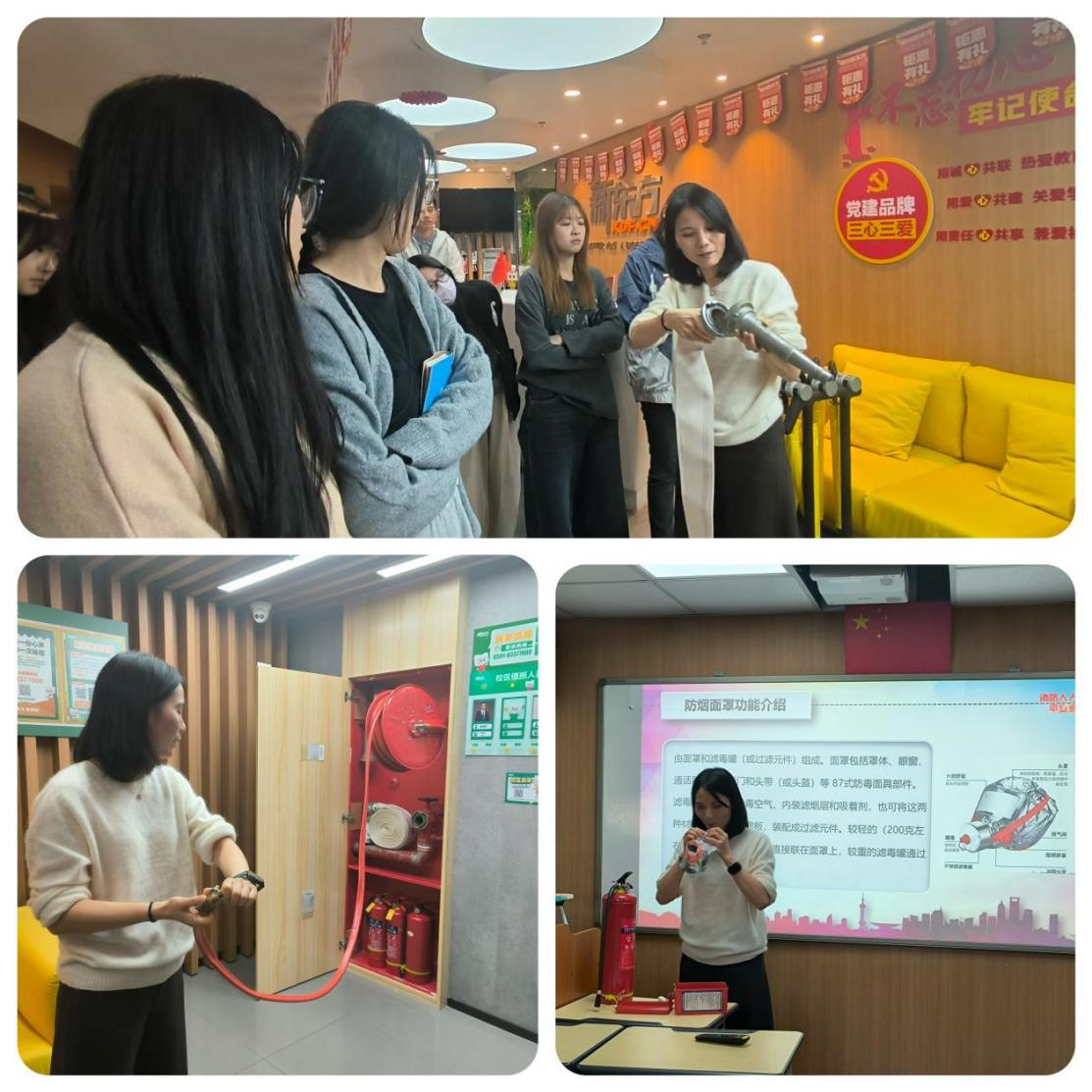 培训以真实火灾案例切入,直击消防安全核心痛点。消防专家结合校区场景,从用电安全、易燃物管理、消防通道畅通等关键环节拆解实用知识。现场示范消火栓、灭火器、呼吸面罩的正确用法后,师生们踊跃上台实操,专家一对一纠正细节,确保每个人都能熟练掌握基础消防技能,学习氛围热烈又扎实。