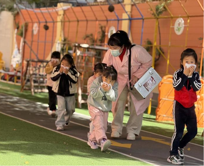 上午9:50,急促的警报声响起,演练正式启动。各班教师秉持“安全第一”原则,按预定路线、方向引导幼儿捂住口鼻、弯腰小步快走,有序向安全出口撤离。全程幼儿情绪稳定,无推搡、拥挤、争抢现象,3分钟内快速抵达户外安全地带后,教师立即清点人数并上报,整体过程井然有序、沉着高效。