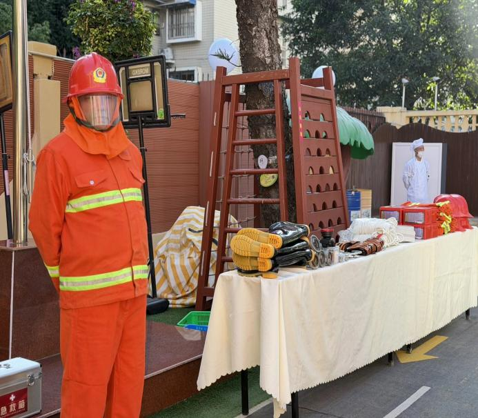 警报解除后,安全专干林老师对演练进行总结,肯定师幼沉着有序的表现,强调危险时刻需听从指挥、做好自我保护。随后针对不同年龄段幼儿设计提问互动,巩固安全知识;保安与教师现场讲解消防器材用途,组织幼儿体验消防服,以沉浸式互动深化幼儿安全认知,现场氛围热烈。