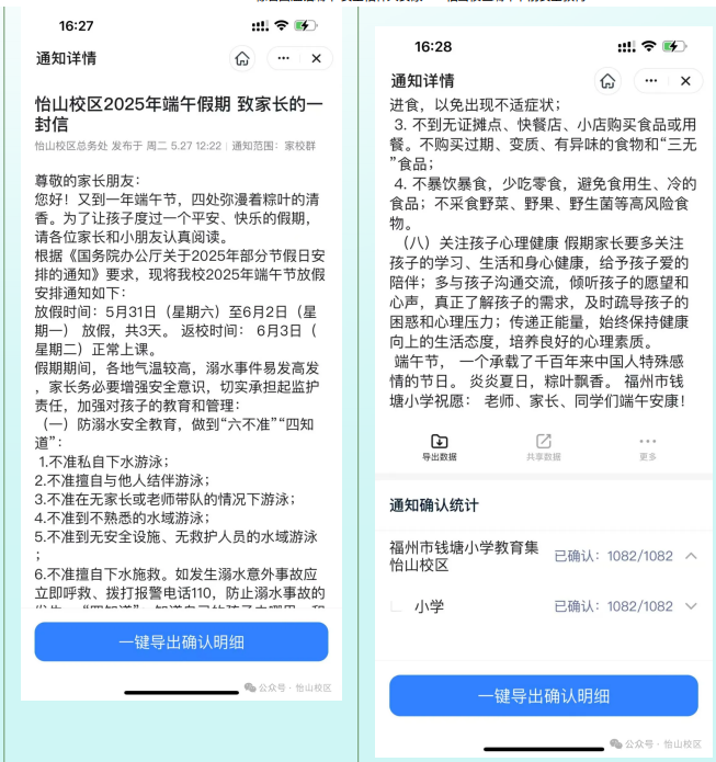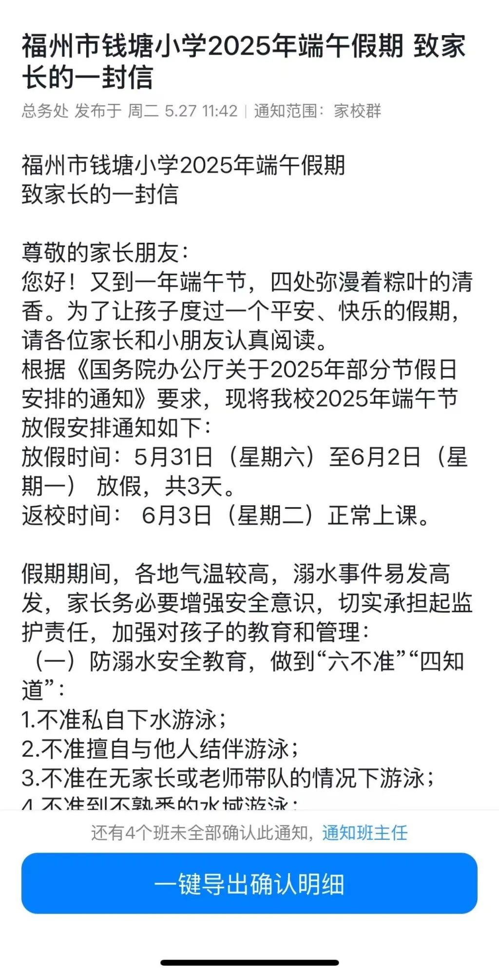 学校常态化落实 “1530” 安全教育模式,端午假期前,各班级严格执行。每天放学前 1 分钟、周末放学前 5 分钟、节假日放学前 30 分钟,通过安全小提示、案例分析、安全儿歌等多样形式,结合假期特点,开展防溺水、防火、交通安全等教育。让安全意识在学生心中深深扎根,引导学生时刻保持警惕,远离危险,将安全教育融入日常、抓在经常。