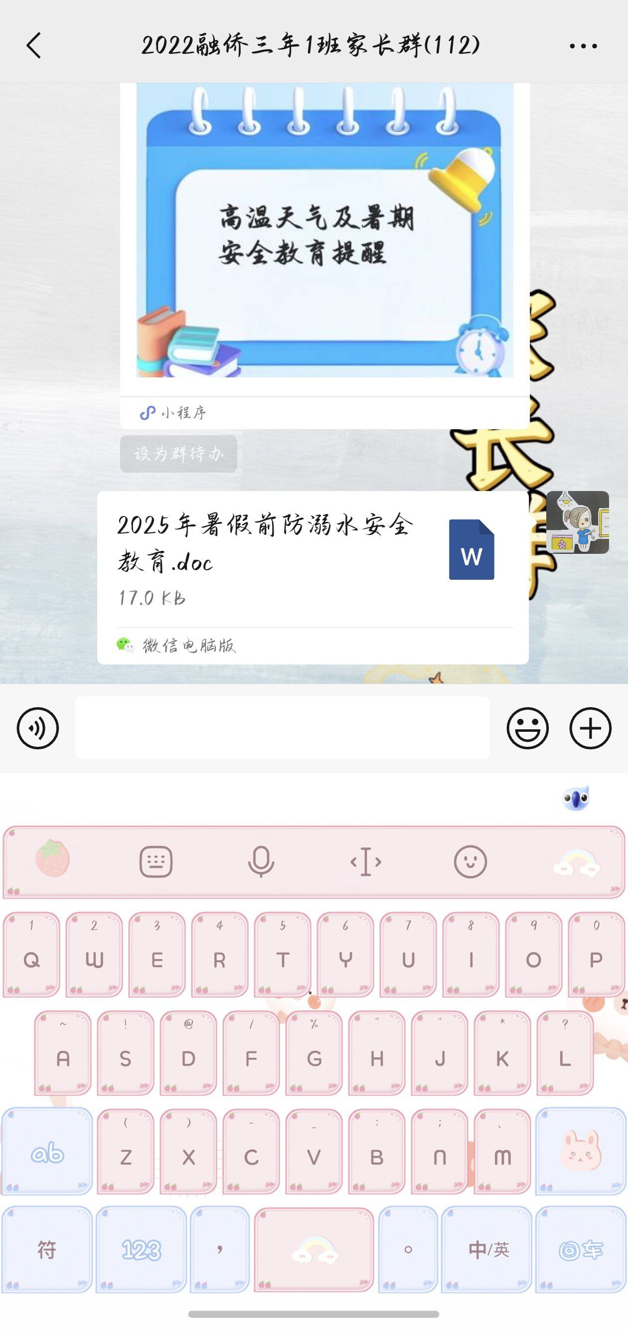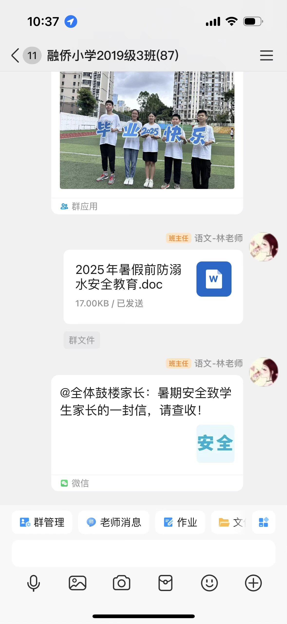 《暑期安全致学生家长的一封信》,借1530安全信息化平台,经班级群向家长精准推送安全提醒。信件以案例、条例强调暑期孩子安全监管重要性,围绕防溺水“六不准”等重点,细化注意事项与要求,还附亲子安全实践互动指南,引导家长树理念、履责任,推动家校合力,筑牢学生暑期安全成长屏障。