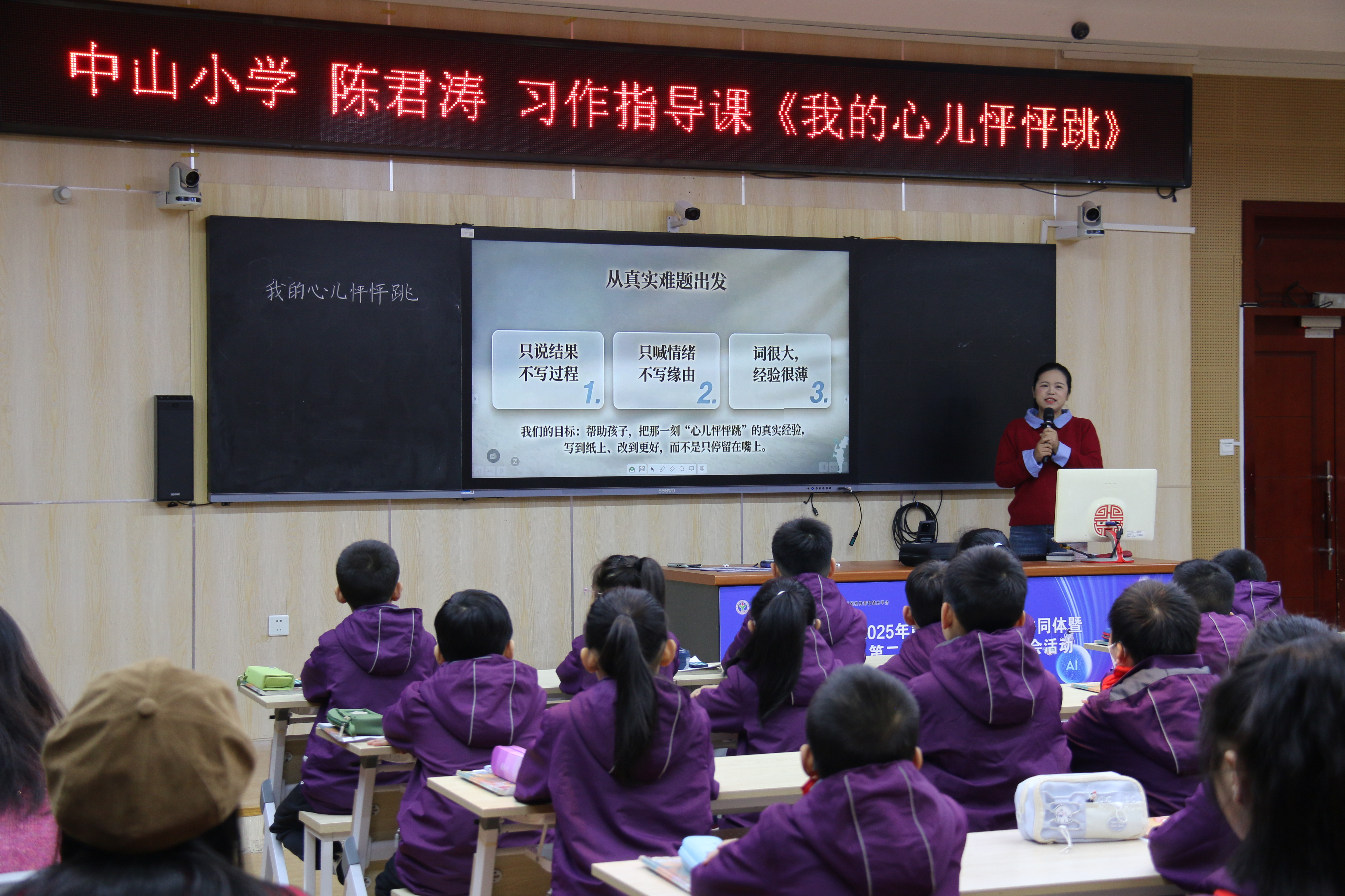 在习作指导课《心儿怦怦跳》中,中山小学陈君涛老师聚焦“唤醒与生成”。利用技术收集学生心跳加速的真实记忆,激活了学生的感官体验。借助人机对比中迅速捕捉让文字“活”起来的秘诀,借助“心跳三连击”,学生即写即改,实现了从“有话说”到“说得好”的跨越。