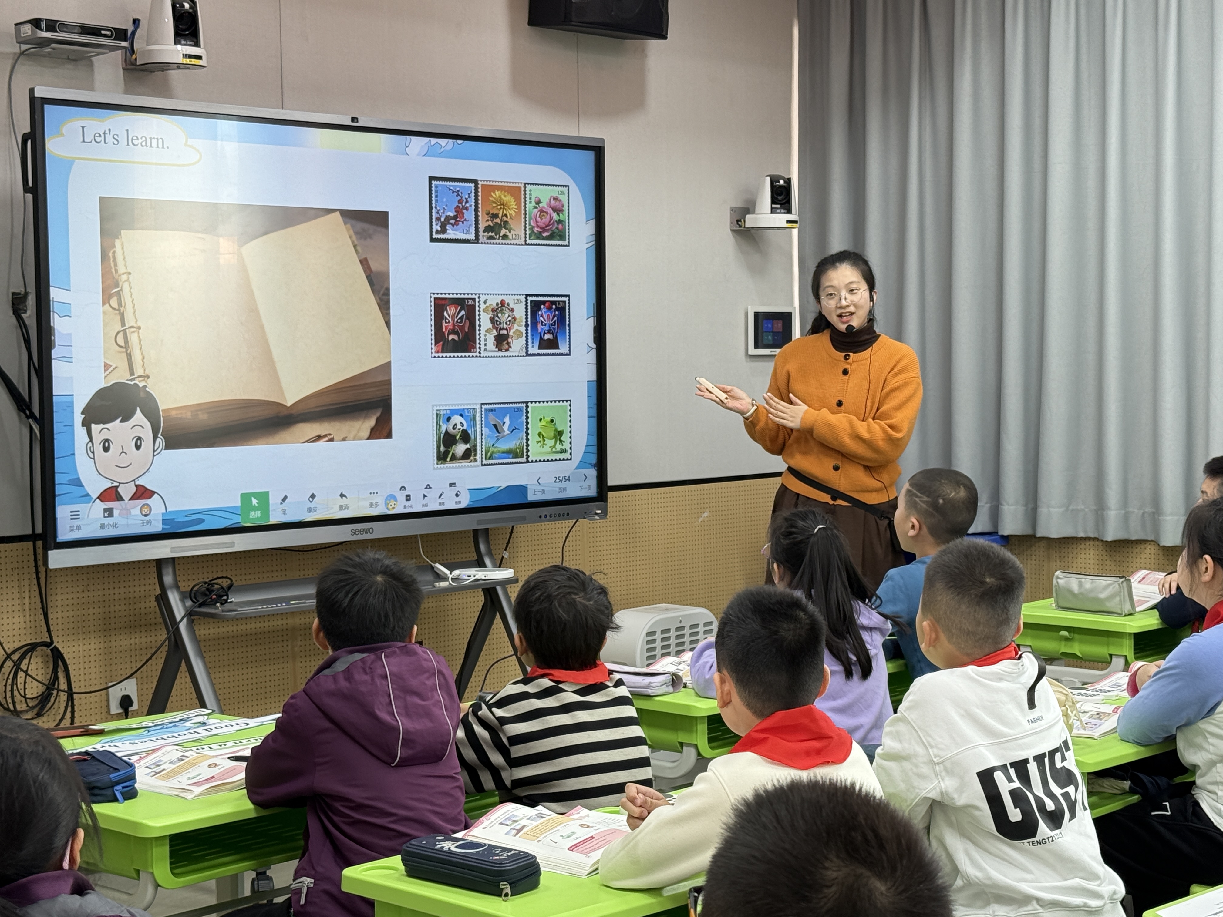 鼓一小江薇老师在研讨课中引入了AI 智能语音测评系统。技术化身为“一对一助教”,对学生发音的准确度与流利度进行毫秒级诊断与反馈。趣味化的任务驱动不仅消解了学生的开口焦虑,更让课堂实现了从“单向灌输”到“高频互动”的转变。