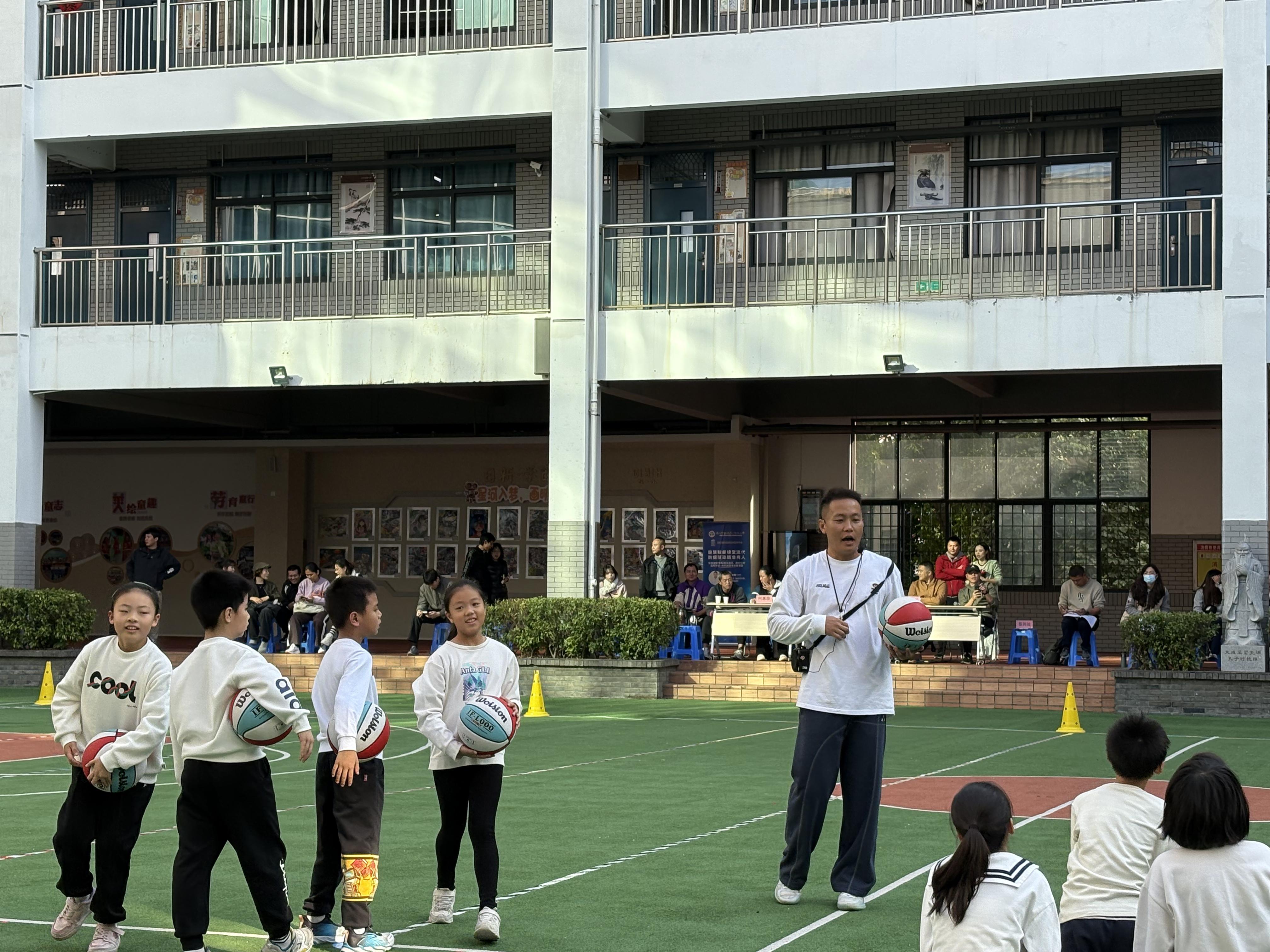 中山小学夏彰键老师则针对低段学情,带来了《操控性技能:篮球运球》。他以游戏化任务贯穿全课,利用 AI 设备实时监测运动密度与生理负荷。在数据的科学导航下,课堂既有“热辣滚烫”的趣味体验,又有“精准高效”的技能达成,完美诠释了“乐中练、玩中学”的智慧体育新样态。
