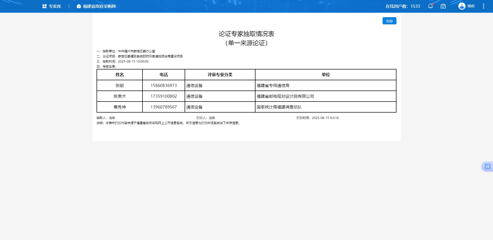 论证专家抽取情况表(单一来源论证)